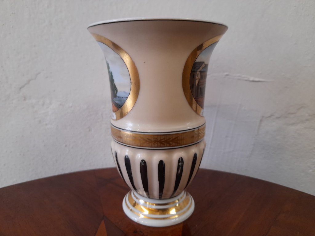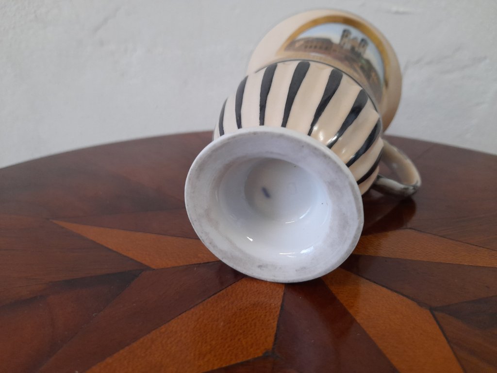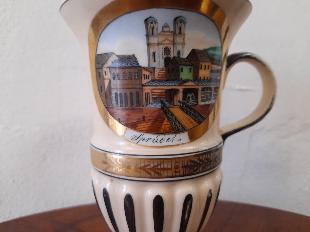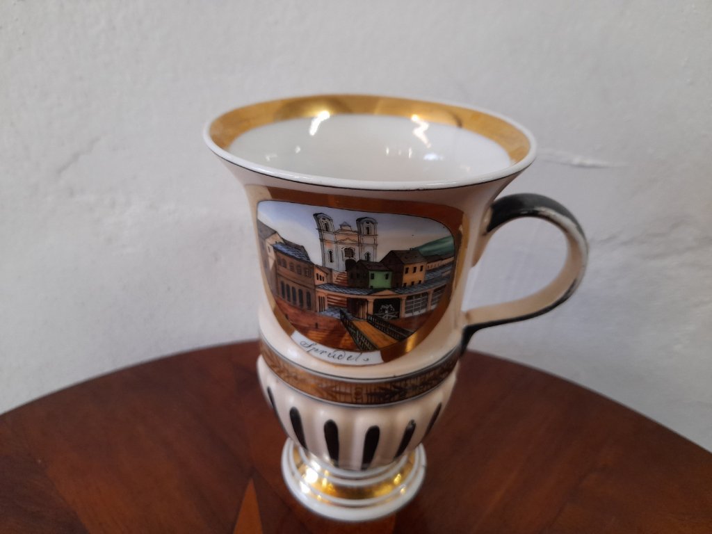 Porcelánový lázeňský pohárek se dvěma vedutami Karlových Varů, značeno, rok cca.1840, ruční malba, výška 11,5 cm, pěkný původní stav.