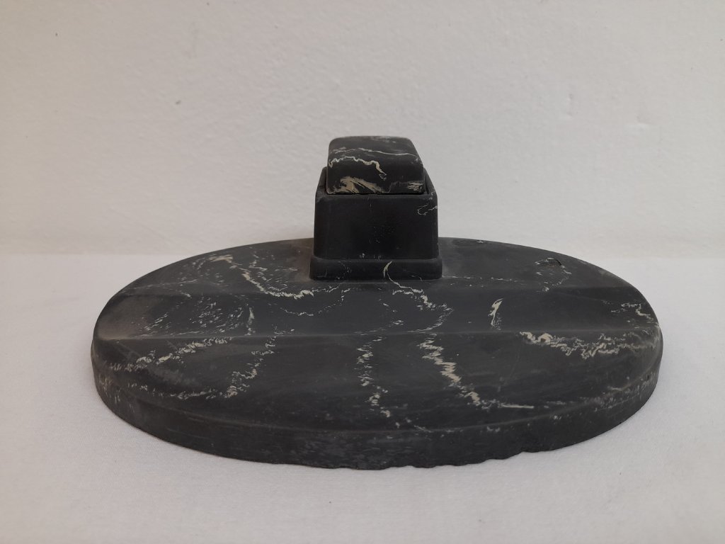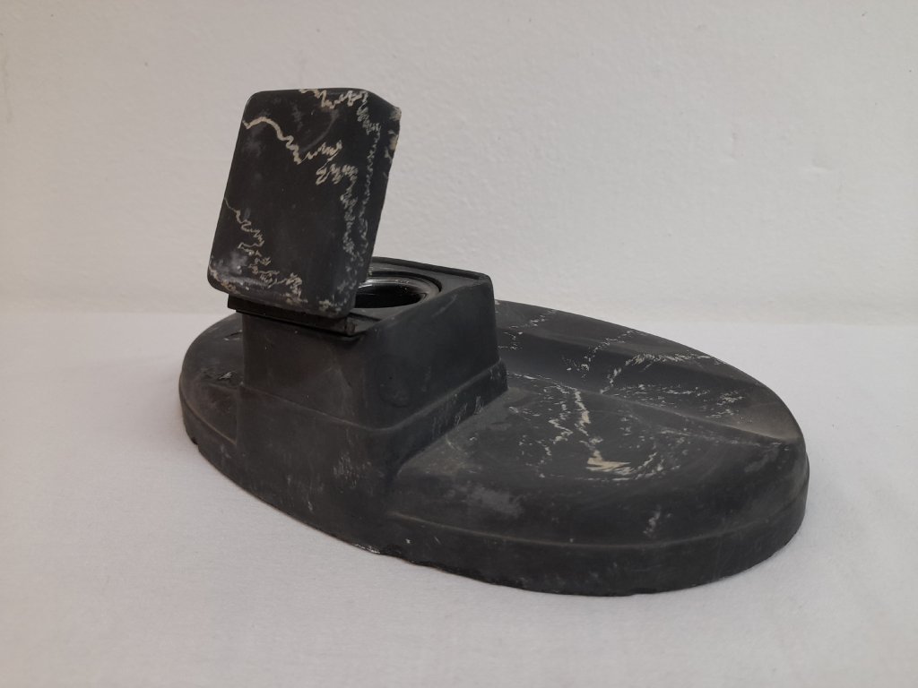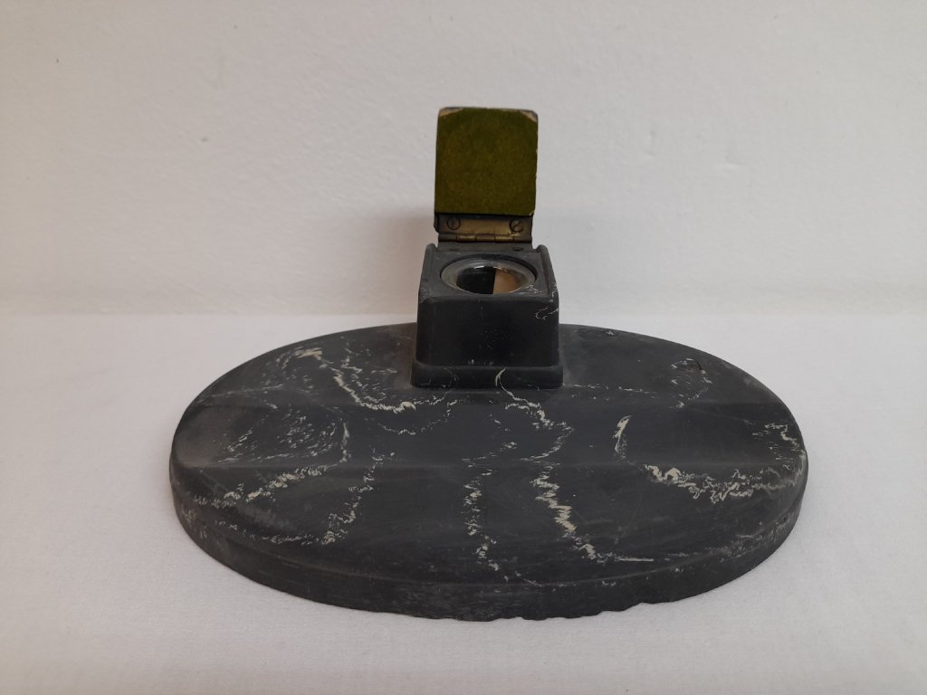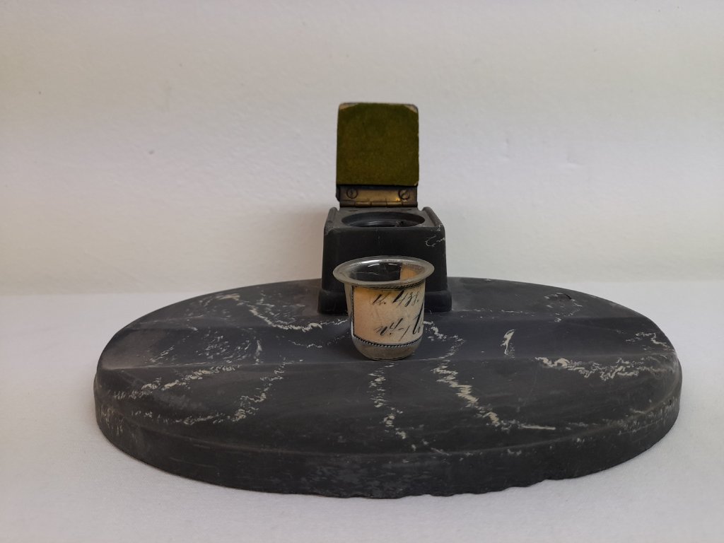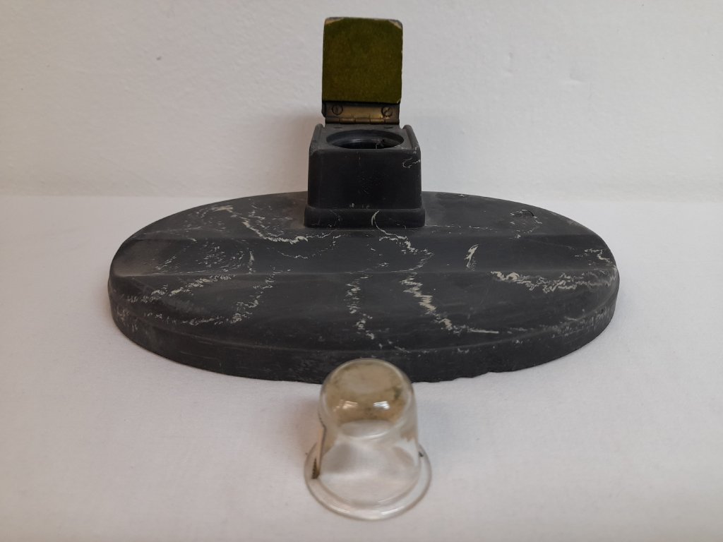 Kalamář, rok cca.1910, původní skleněná nádobka, šířka 23 cm, hloubka 15 cm, drobné poškození.
