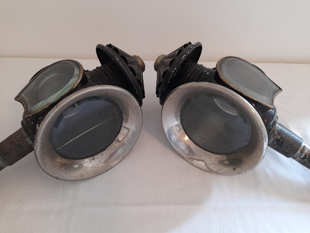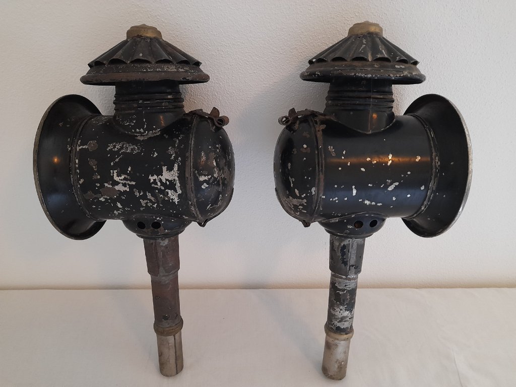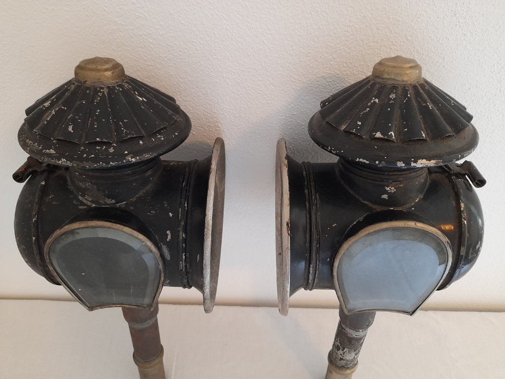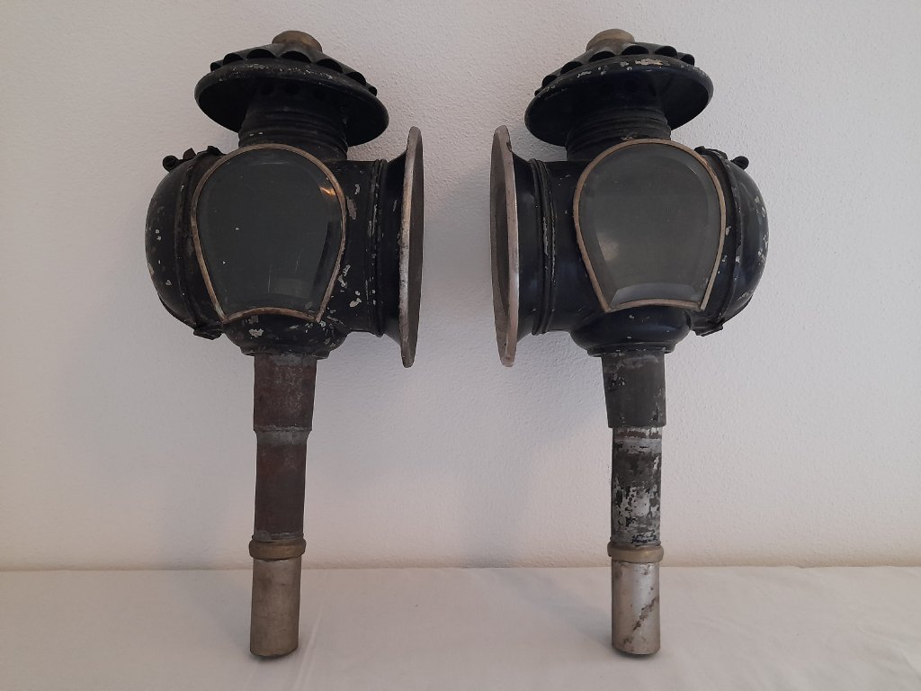 Dvě kočárové lampy, rok cca.1900, silně poškozené, nekompletní, prasklé sklo.