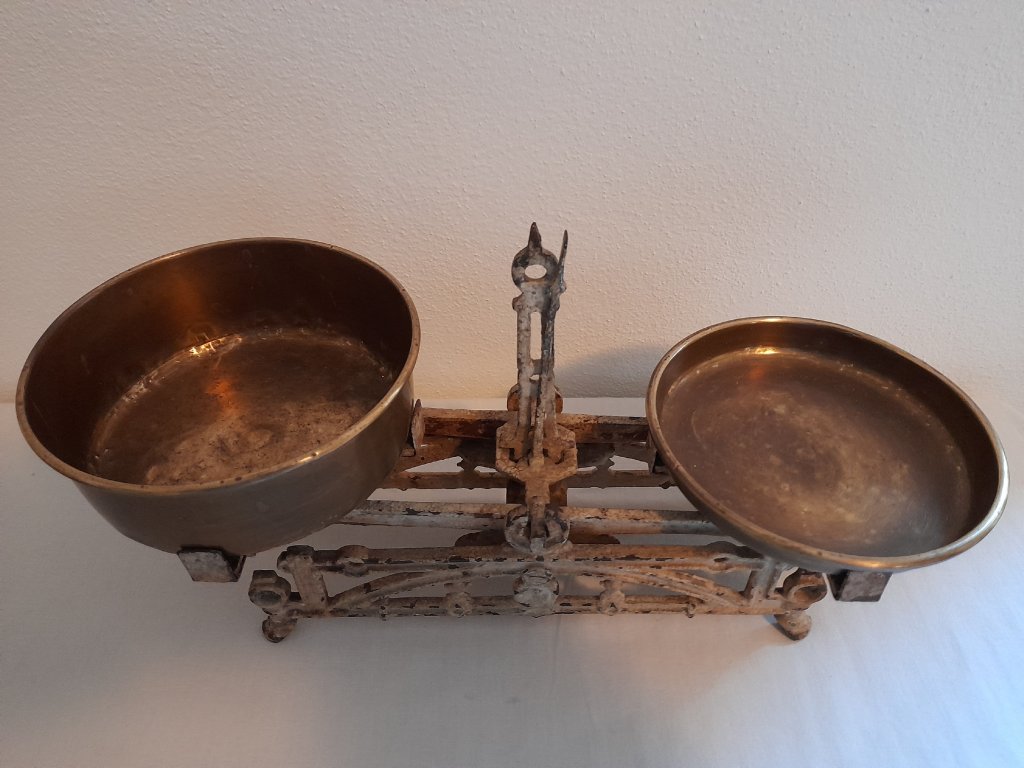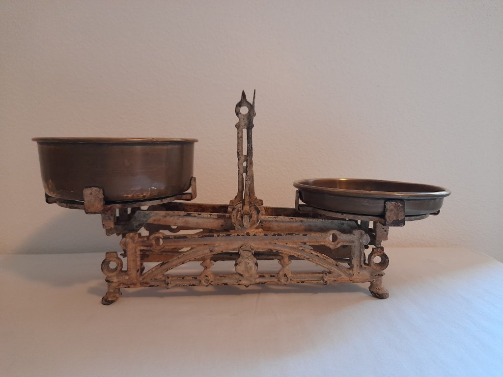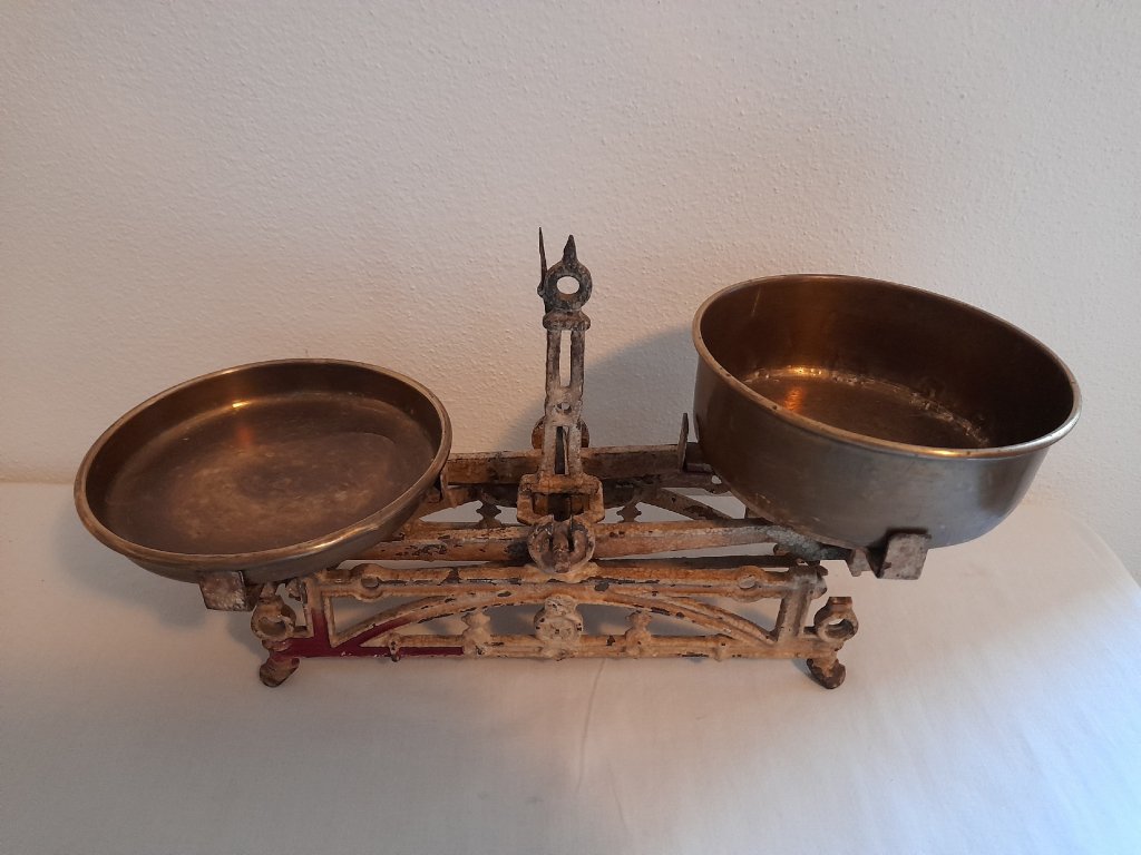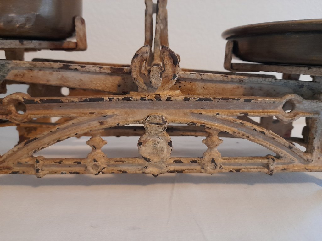 Malé litinové váhy na 2 kg, rok ca.1880, mosazné misky, původní stav, šířka 36 cm.