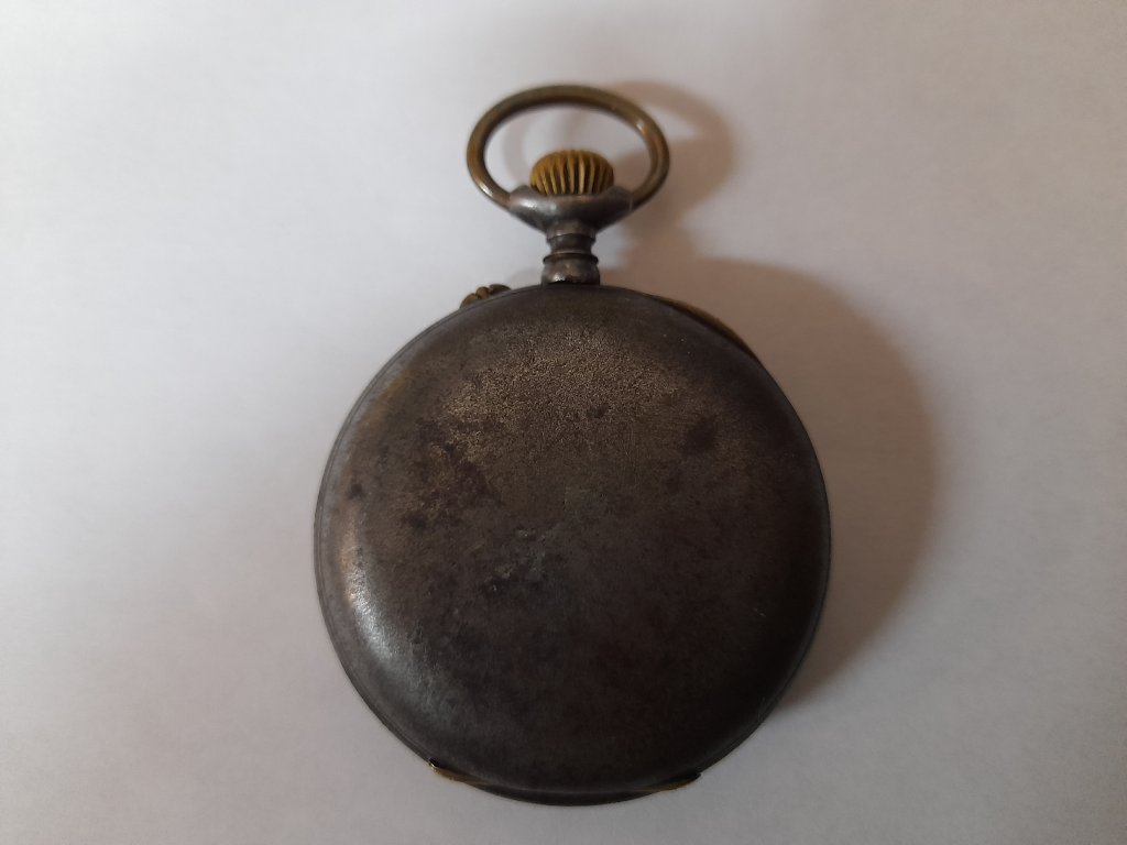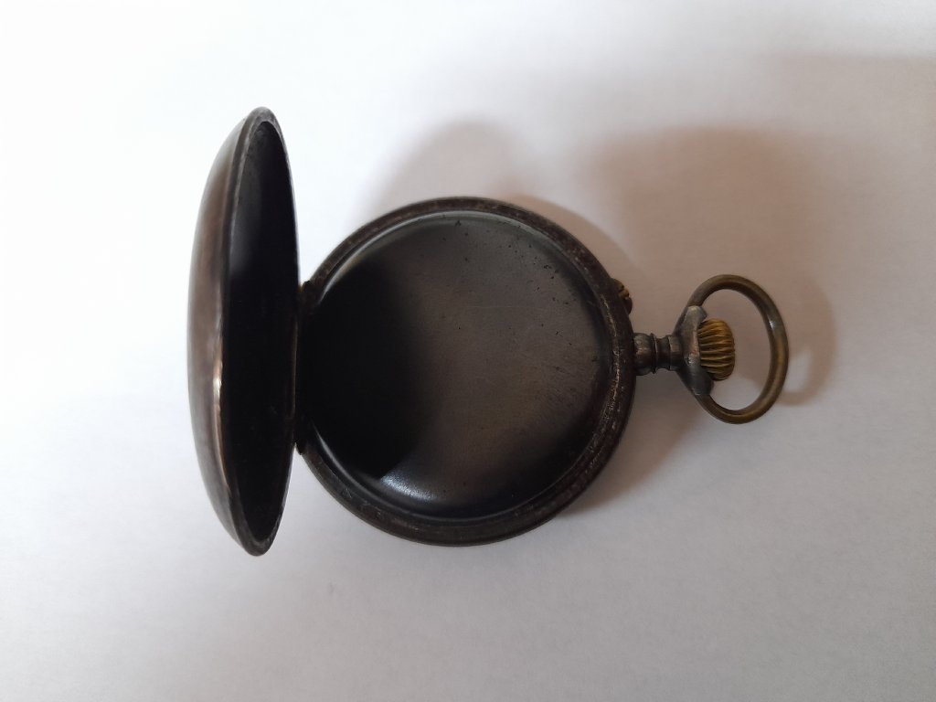Kapesní hodinky s kalendářem, rok 1900, brynýrovaná ocel, smaltovaný číselník poškozen, kotvový strojek funkční, průměr 53 mm, váha 106,7g.