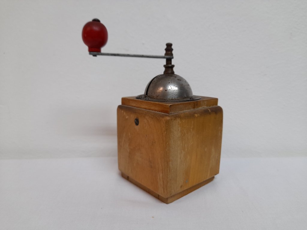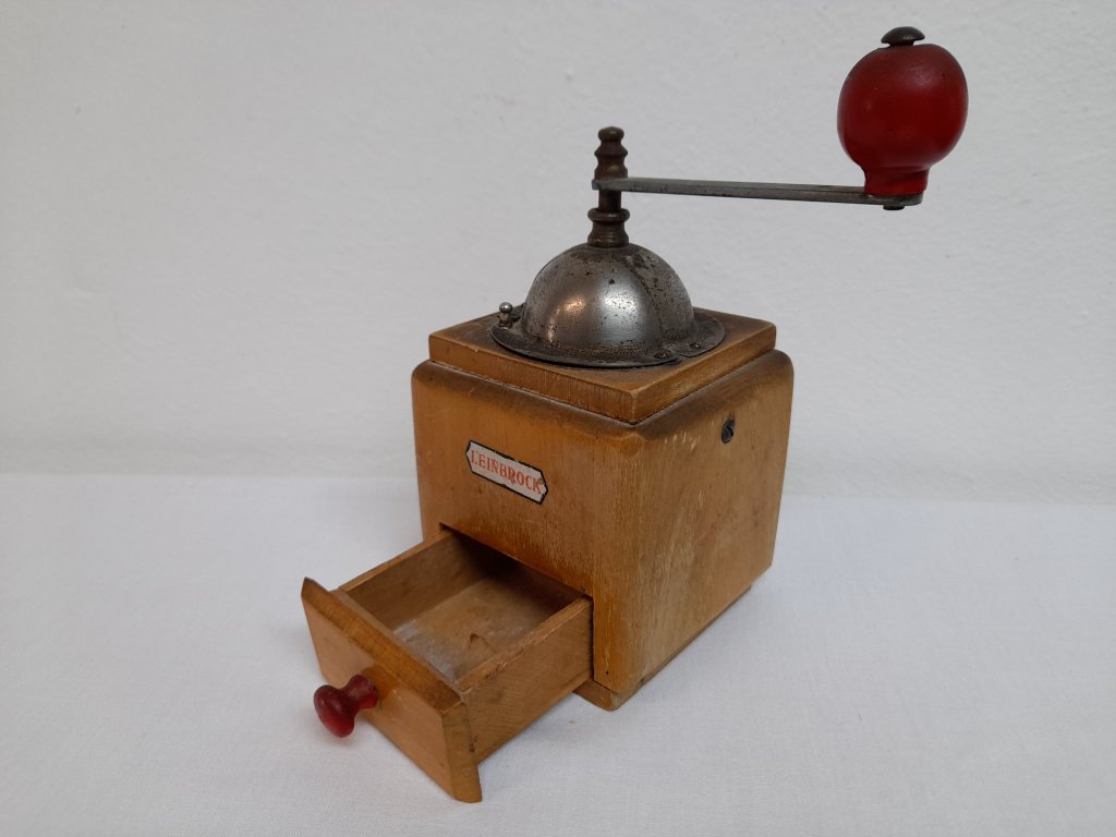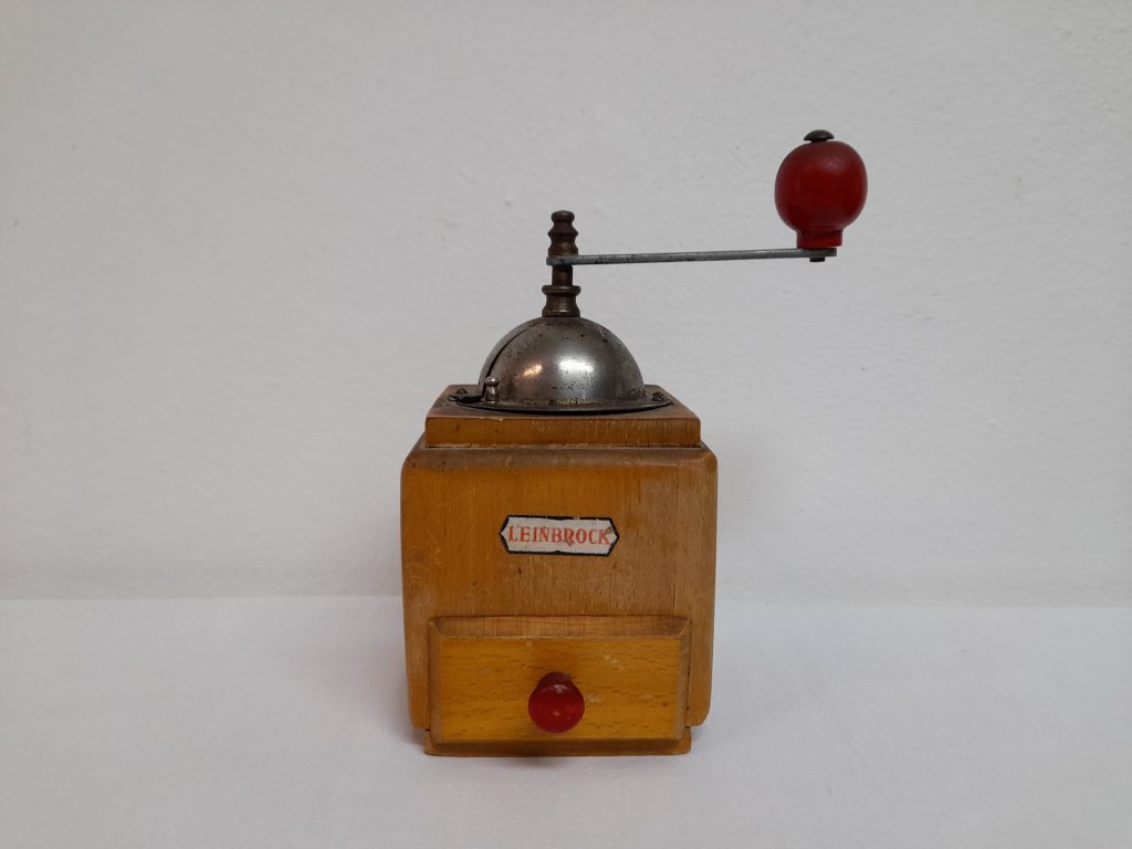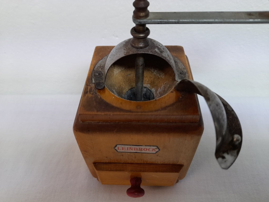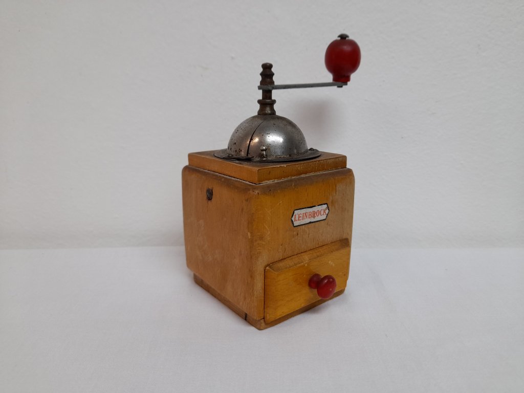 Velmi malý mlýnek na kávu, značen Leinbrock, rok cca.1930, šířka 8 cm, hloubka 8 cm, dobrý stav.