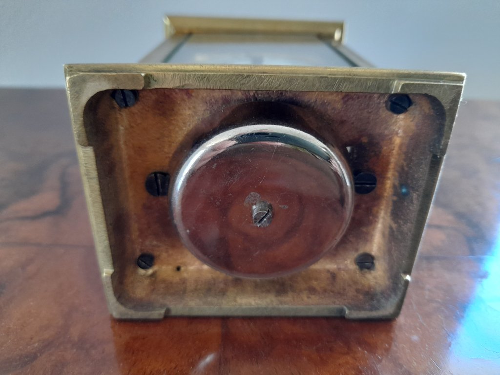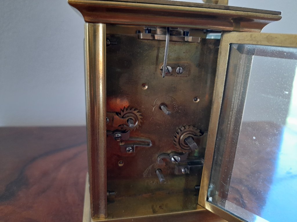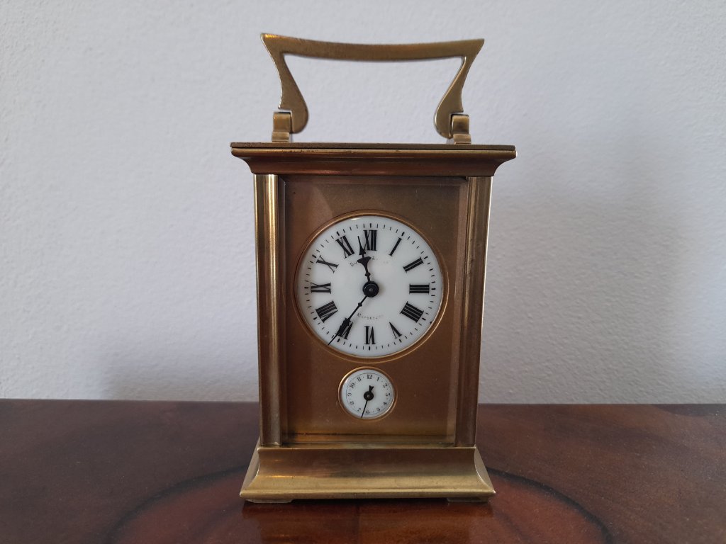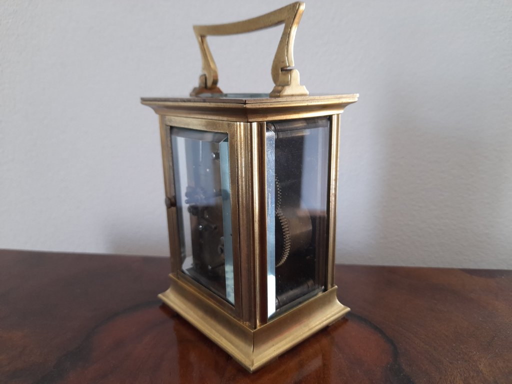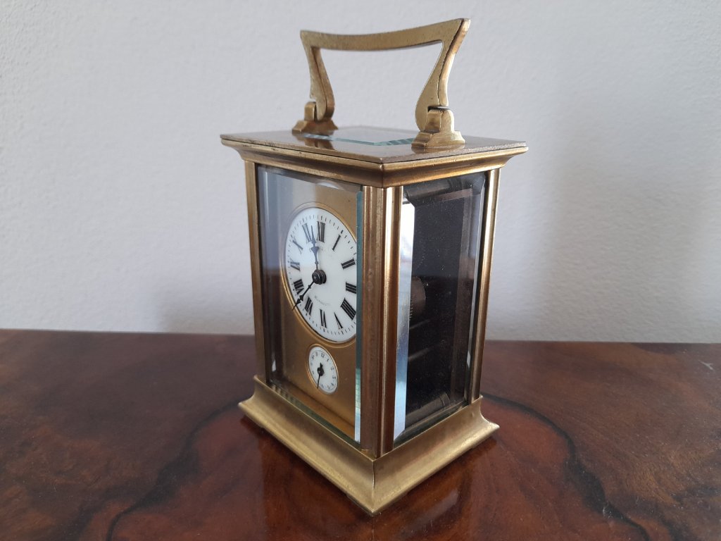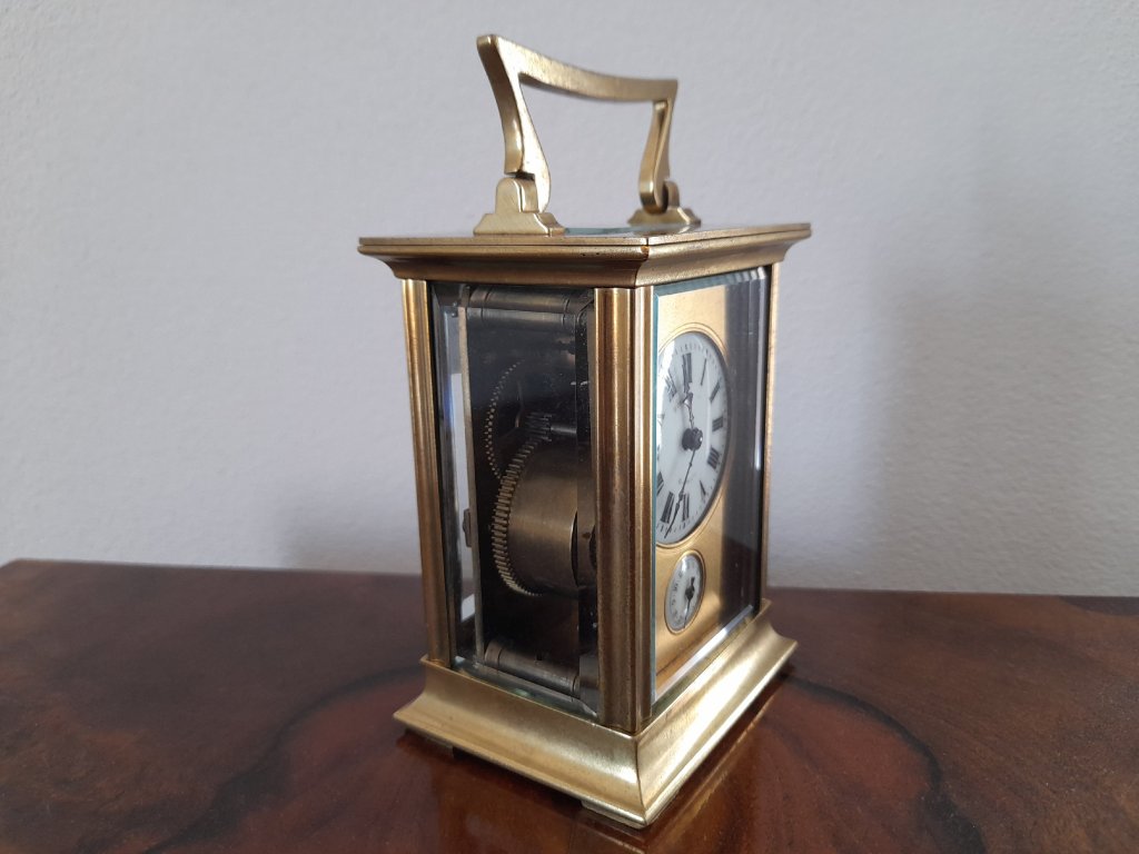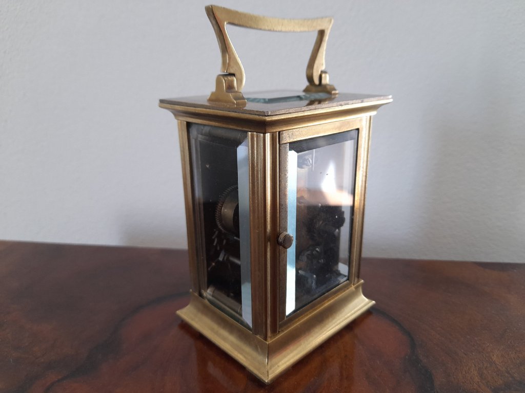 Francie, rok 1900, mosaz, broušená fazetová skla, velmi kvalitní provedení, doba chodu 8 dní, výška 14 cm, šířka 8 cm, plně funkční, velmi dobrý stav.