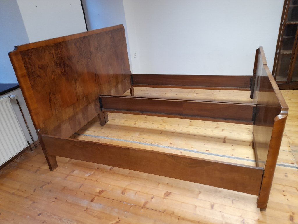 Dřevěné postele, rok cca.1925, dýhováno, max. výška 120 cm, délka 190 cm, šířka 200 cm, na několika místech poškozeno.